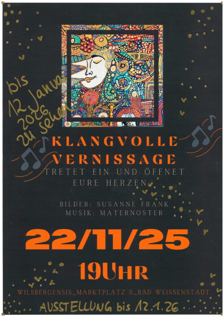 Susanne Frank, Klangvolle Vernissage „tretet ein und öffnet Eure Herzen“, 22.11.2025 bis 12.01.2026
