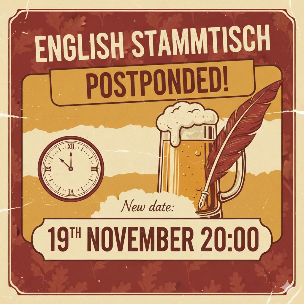 Hi everyone, unfortunately, I'll have to postpone the Stammtisch again. I have to attend a funeral, so I won't be able to hold the Stammtisch on the 12th. We will meet the week after instead - on the 19th.